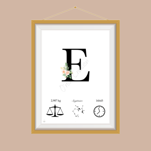 Affiche naissance personnalisée avec la première lettre du prénom de votre enfant, garnie d’une jolie rose, ainsi qu’avec quelques informations comme le poids, l’heure, et le signe astrologique. Un joli cadeau fleuri pour une naissance !