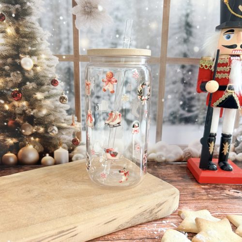 Faites briller vos fêtes avec le gobelet Douce Féérie. Ses illustrations à l’aquarelle mêlent casse-noisettes, bonshommes en pain d’épice et boules de Noël dans de jolis tons roses et dorés.