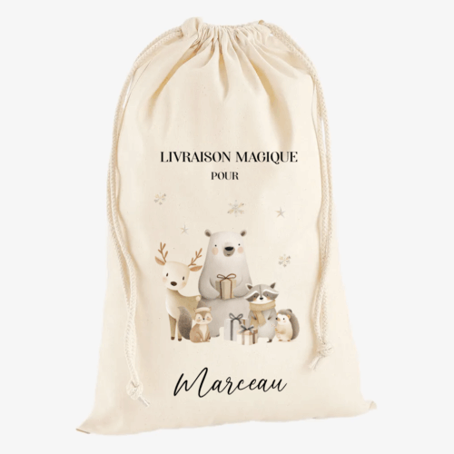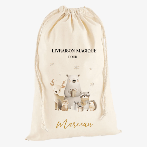 Entrez dans un univers féerique avec cette hotte de Noël où s’invitent les animaux de la forêt : ours, hérisson, écureuil et autres compagnons vêtus de leurs bonnets. Une scène douce et joyeuse qui évoque la convivialité et la magie des fêtes.