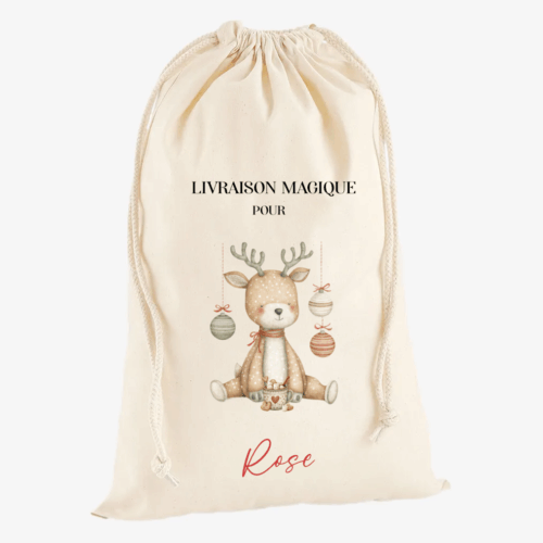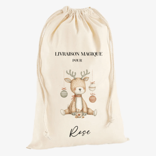 Cette hotte de Noël en coton 100 % naturel capture la tendresse de l’hiver avec son joli renne assis, les bois décorés de boules de Noël et une tasse de chocolat chaud entre les pattes. Un design plein de douceur et d’esprit cocooning, parfait pour attendre le grand soir de Noël.