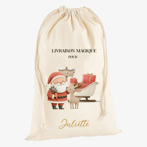 Laissez la magie opérer avec cette hotte personnalisée, illustrant le Père Noël, son fidèle renne et leur traîneau chargé de cadeaux. Une scène traditionnelle et intemporelle, symbole de générosité et d’émerveillement.