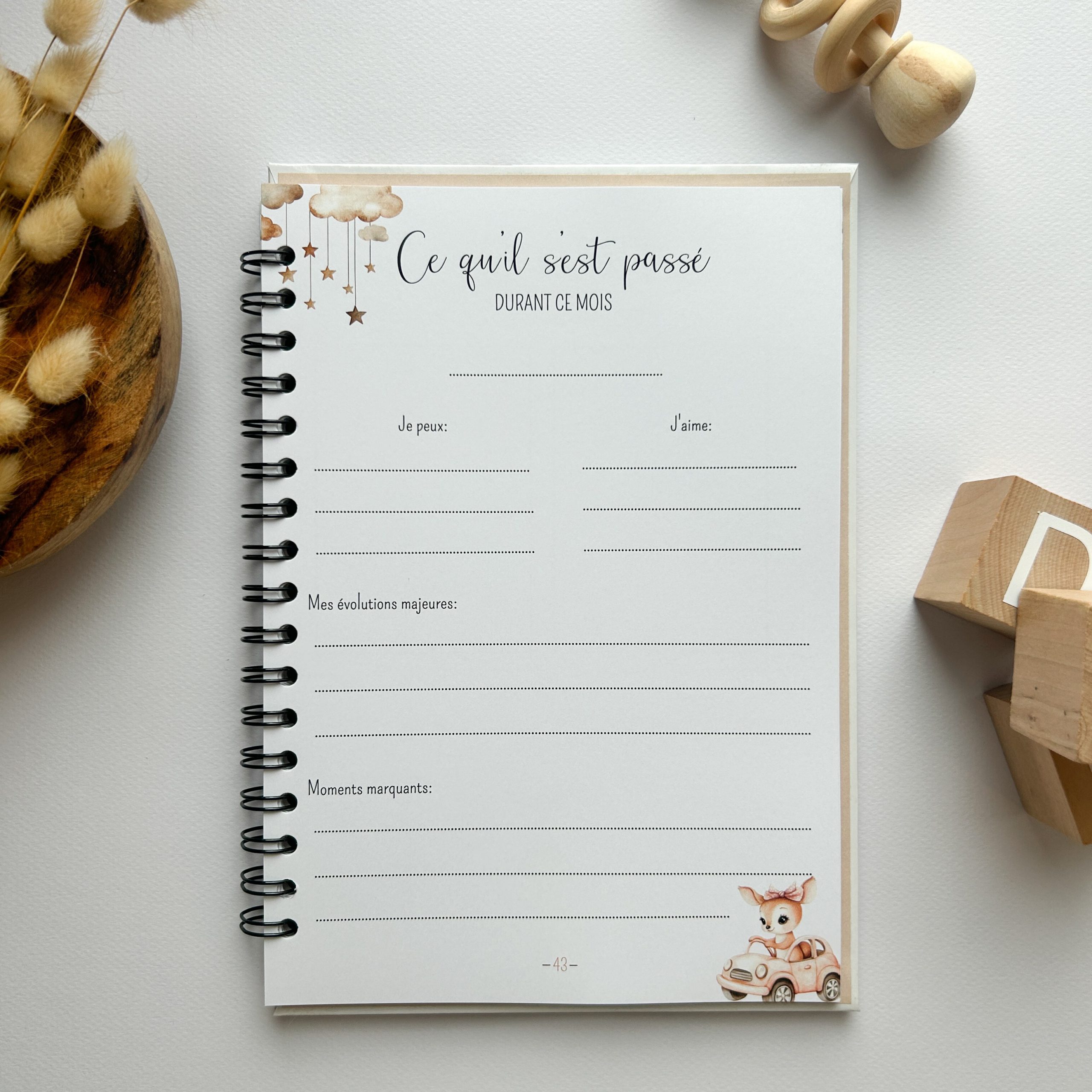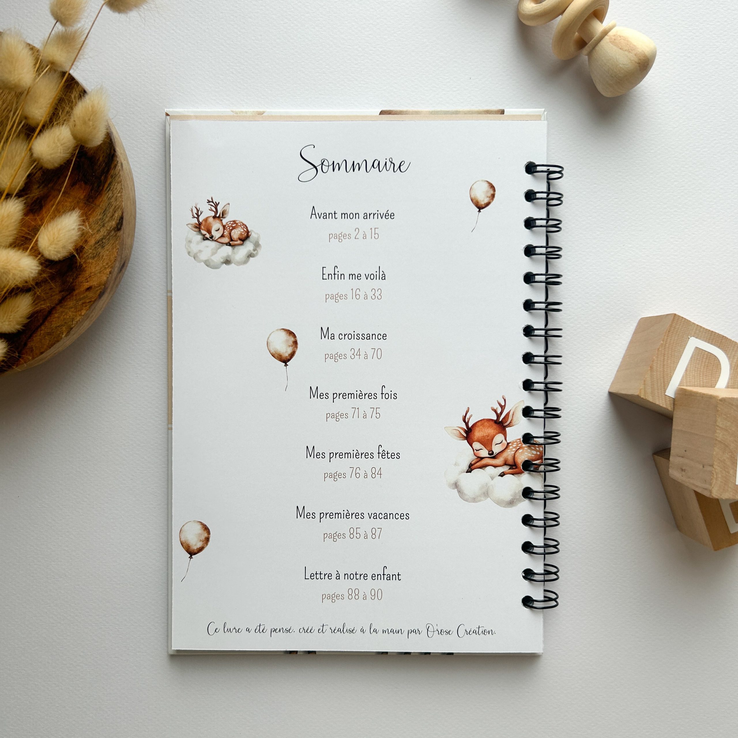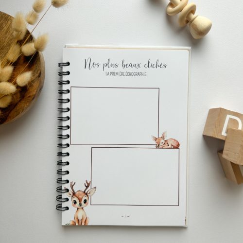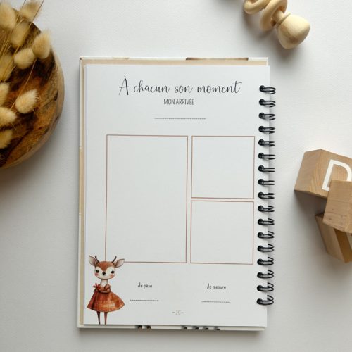 J’ai voulu ce livre aussi beau que robuste, sa couverture laminée est prête à affronter la vraie vie de parents ! Elle ne craint ni les petites gouttes d’eau, ni les maladresses avec le biberon de lait. Côté pratique, sa spirale métallique permet de le manipuler facilement et de le laisser ouvert à plat pendant que vous écrivez. À l’intérieur, c’est un concentré de tendresse avec des sections ultra complètes : l’attente avec les échographies, le récit de leur arrivée, les anecdotes rigolotes, et même leurs premiers grands événements, comme Noël, les vacances ou leur baptême, qu’il soit civil ou religieux.