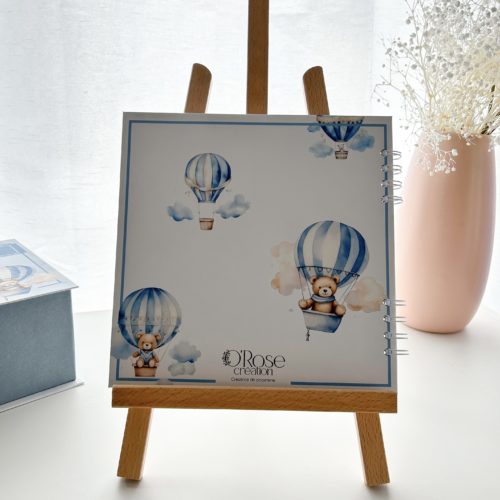 Laissez-vous séduire par ce magnifique livre d’or de baptême et ses petits oursons en montgolfières. Les nuances de bleus sont un vrai plaisir pour l’œil.